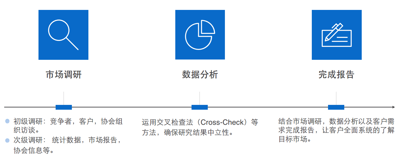 市场调查由初级市场调查及次级市场调查相结合:初级市场调查为与业内人士的对话访谈,包括协会负责人、企业负责人、专业媒体编辑等;次级市场调查为案头数据、相关报告整理分析, 数据源均经过严格筛选,确保调查报告的精确客观性。